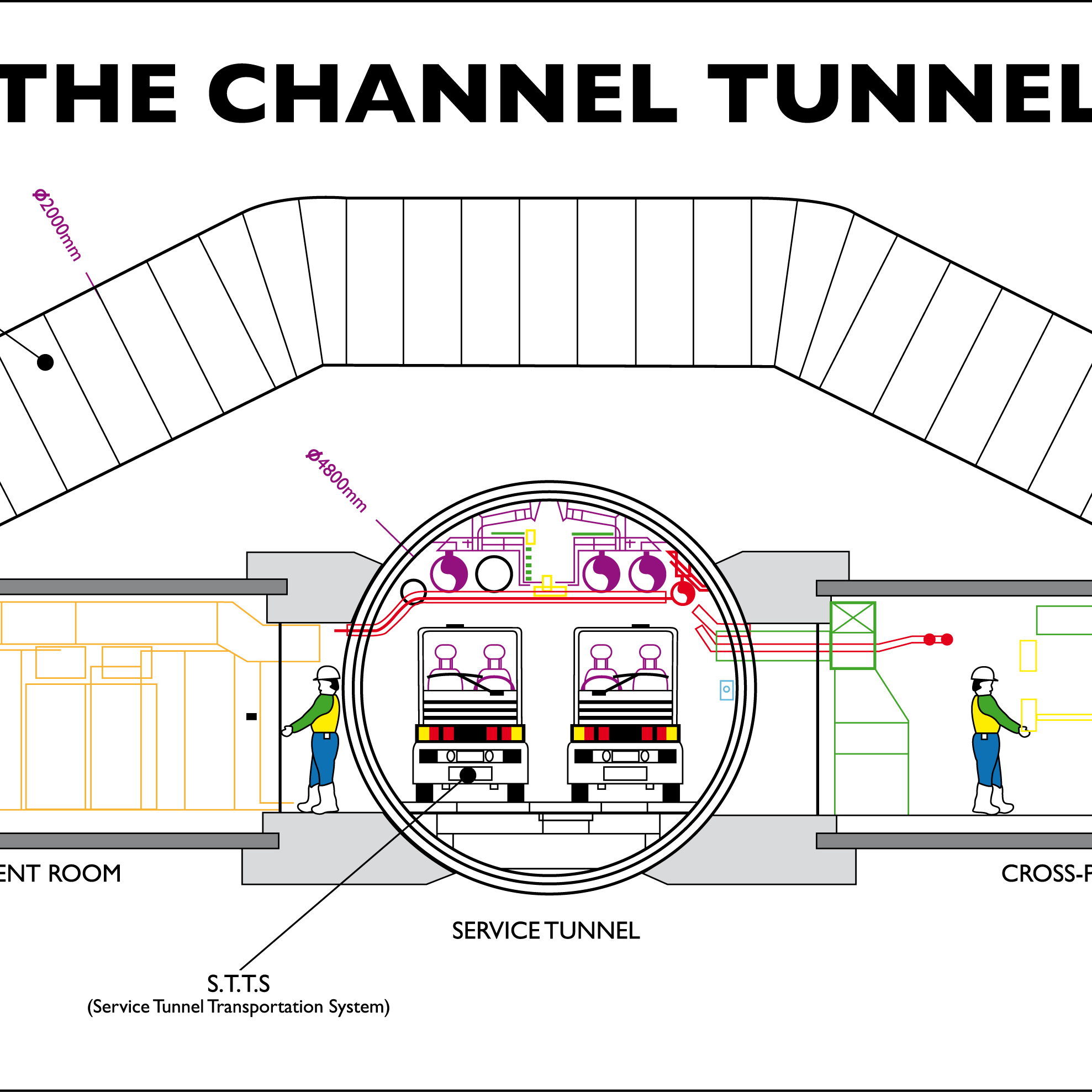 Two single track tunnel and a service tunnel, linked every 375m to the railway tunnels through cross-passages.