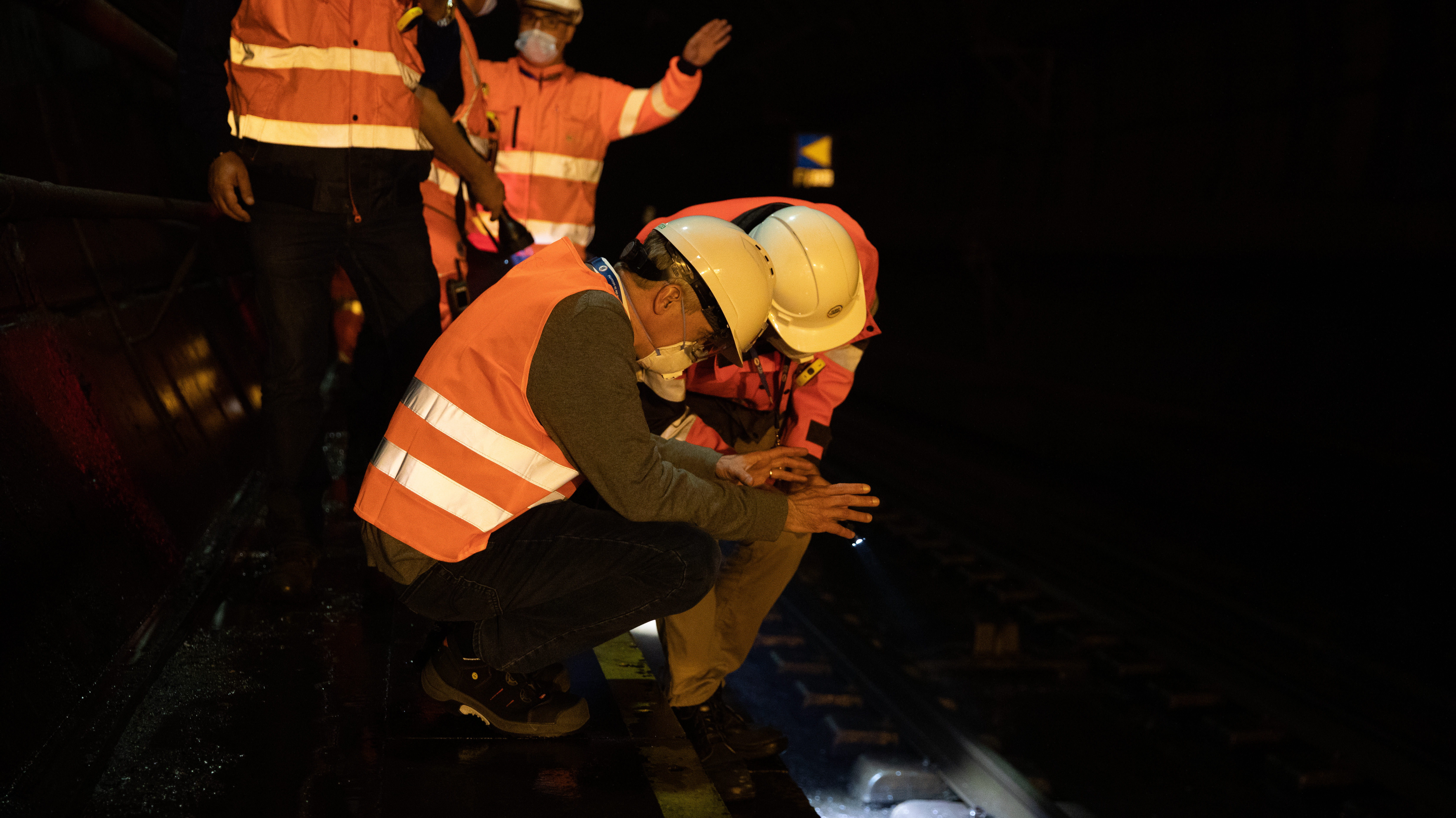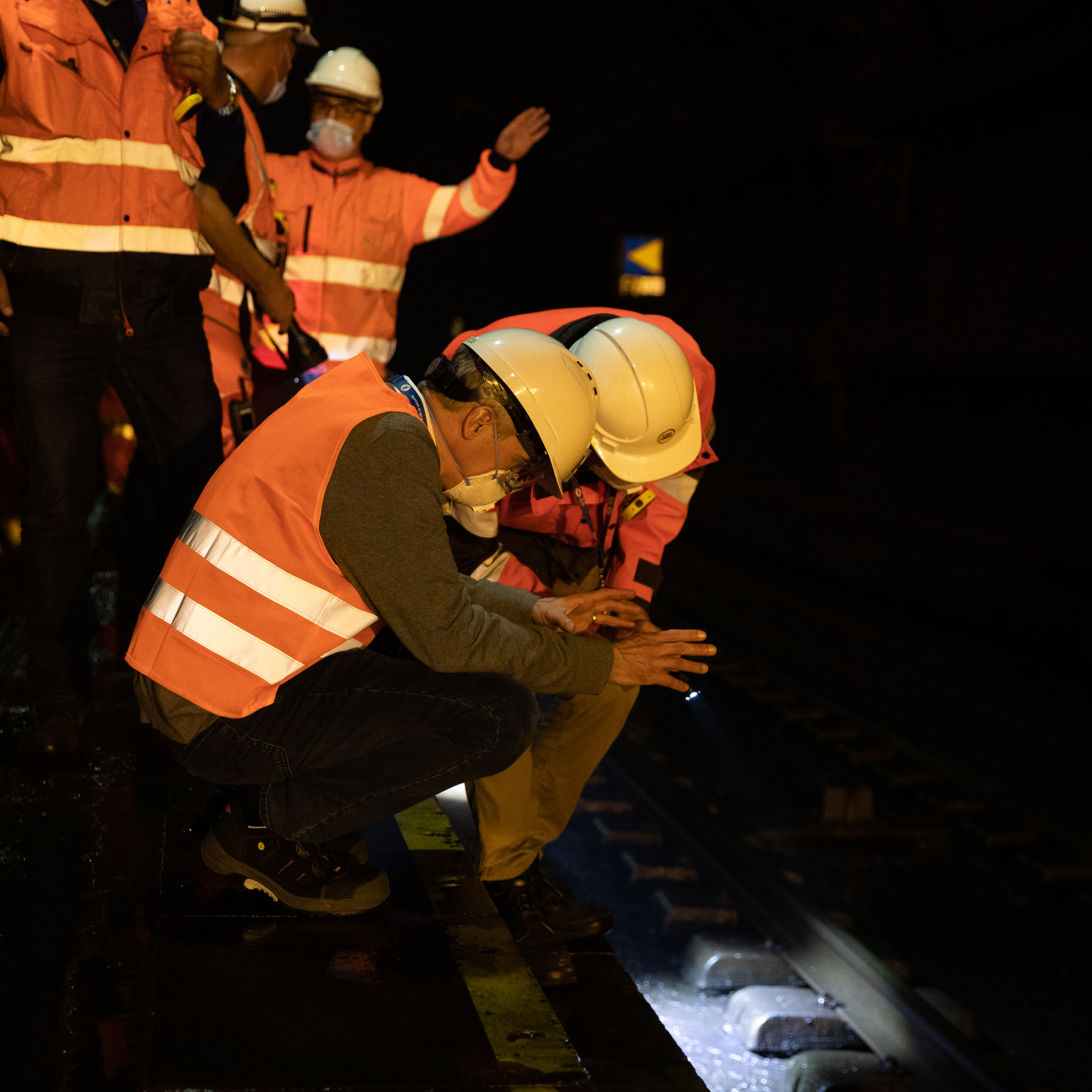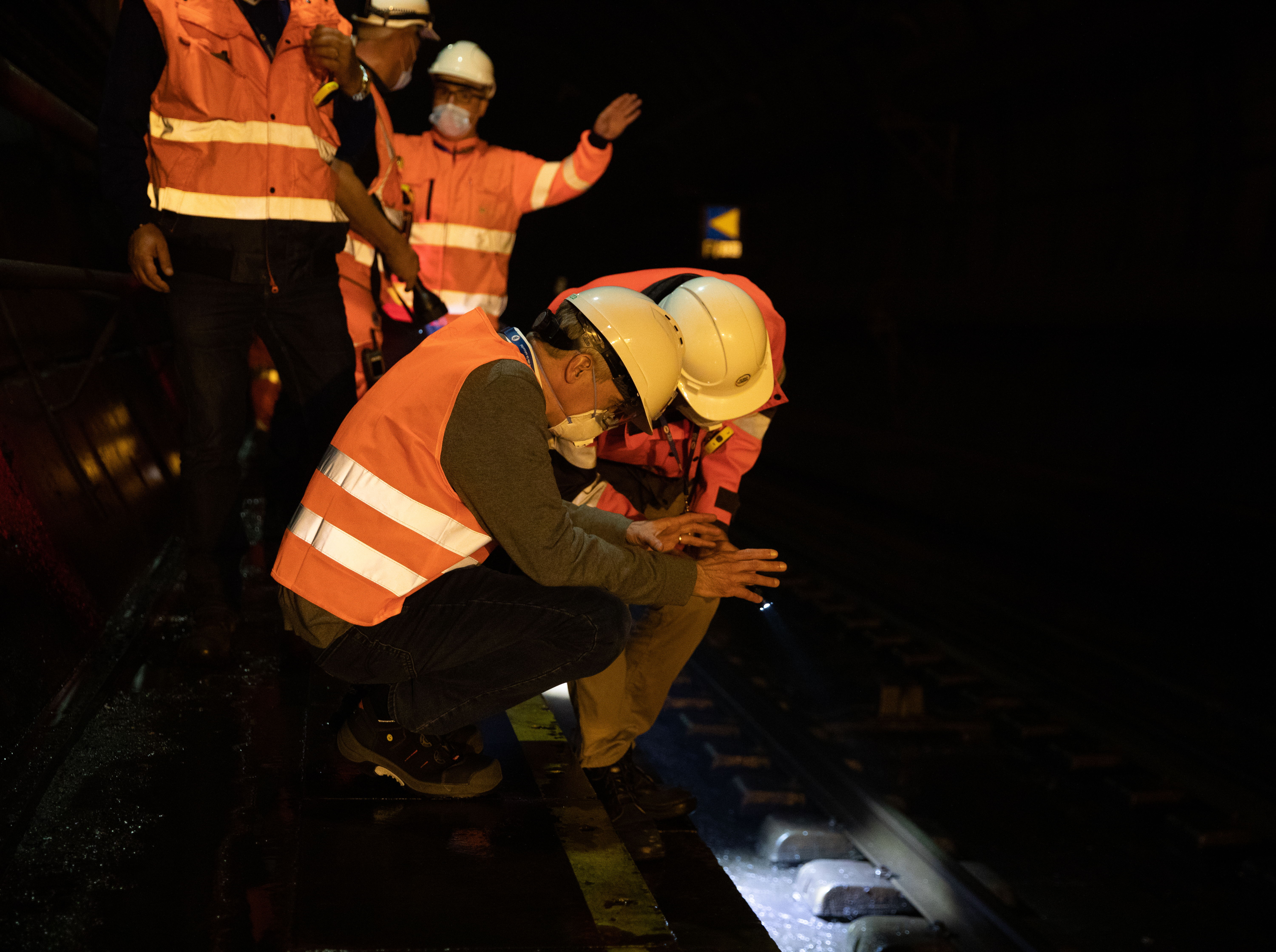 Inspection of the track of one of the railway tunnels during night works, in the presence of Yann Leriche.